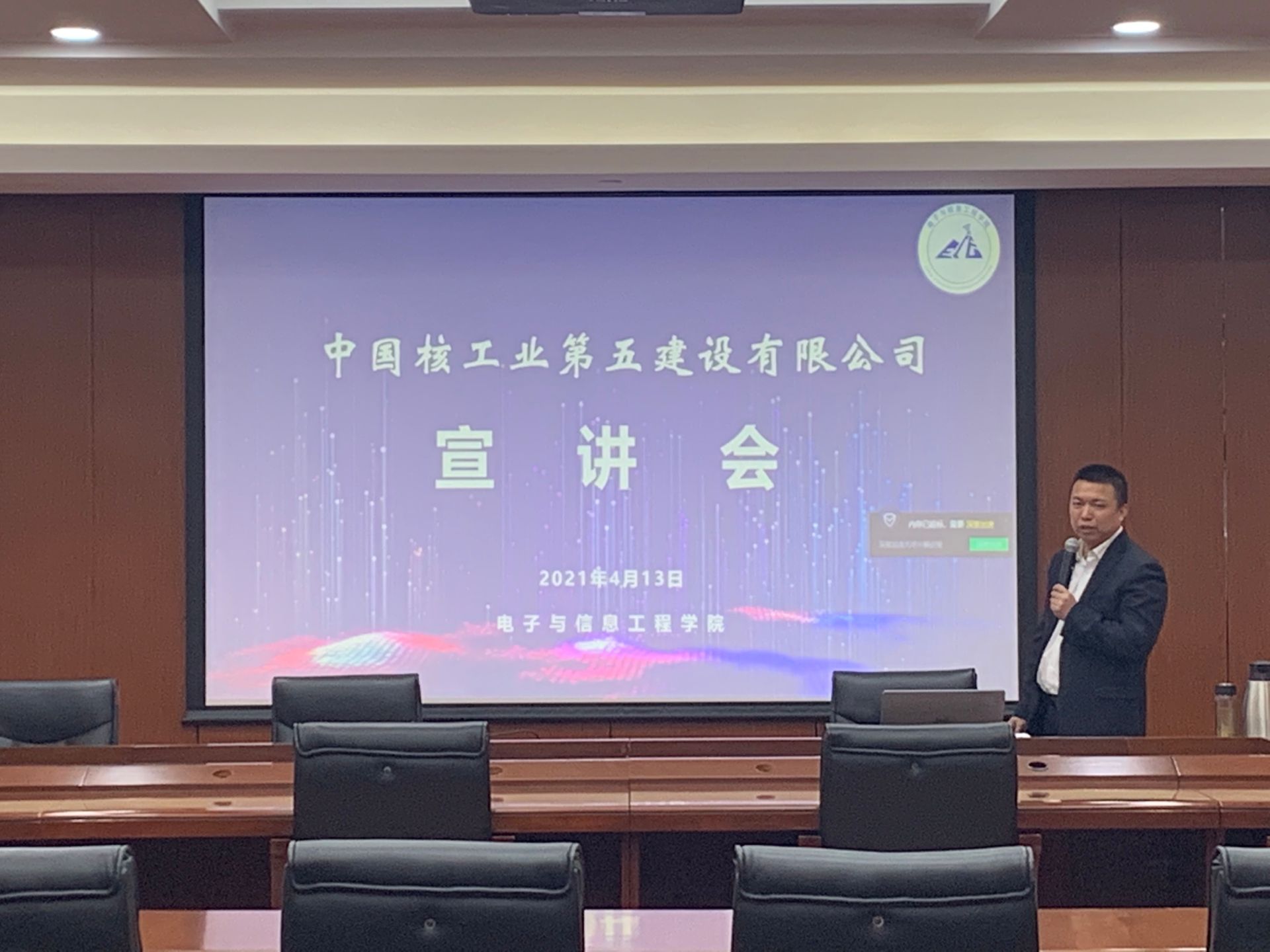 4月13日下午,中国核工业第五建设有限公司专场宣讲招聘会在临港校区学术楼303会议室成功举办,中国核工业第五建设有限公司高级工程师程定富出席并进行宣讲,电信学院老师曾俊东、就业专项负责人黄燕和必赢bwin官网2021届、2022届部分学生参会。