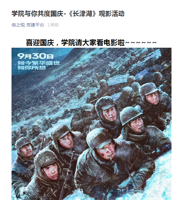 为传承红色基因、赓续红色血脉,进一步弘扬爱国主义精神,激发学生的爱国热情和奋斗精神主旋律,10月3日下午,电信学院组织本科生及研究生集体观看抗美援朝主题影片《长津湖》。观影结束后,学生们相互交流观影心得,纷纷表示要铭记历史,传承并弘扬伟大抗美援朝精神,站在“两个一百年”历史交汇点上不忘初心,牢记使命,为实现中华民族伟大复兴而不懈奋斗。
