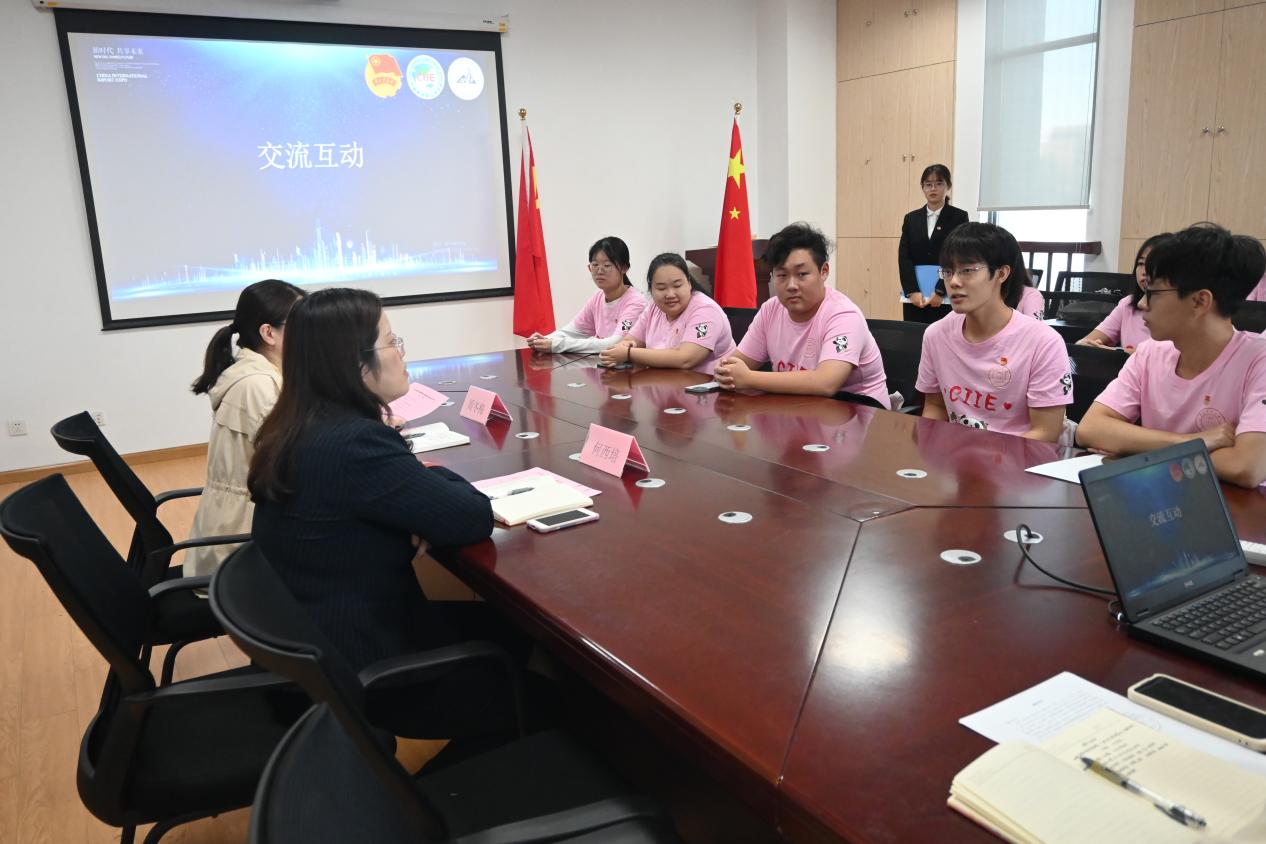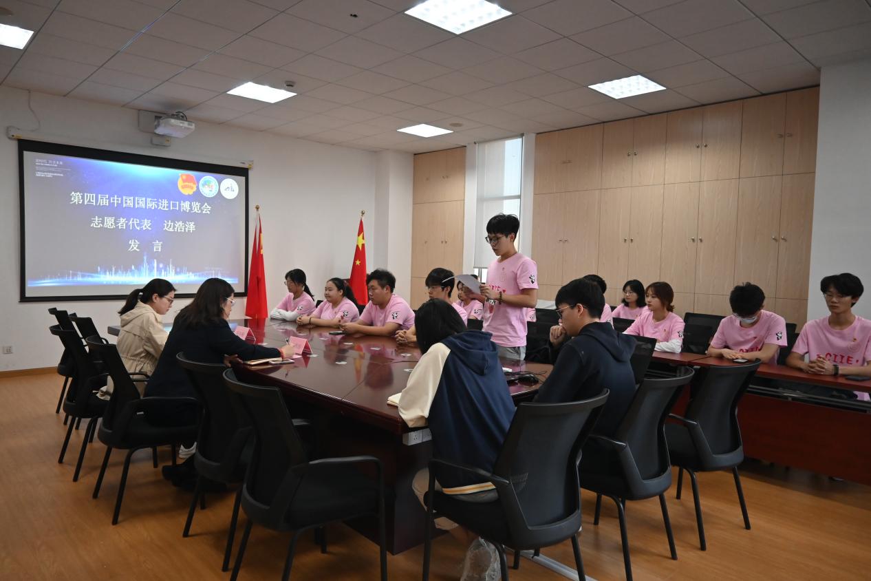 边浩泽同学作为志愿者代表发言,作为中共预备党员、电信学院本届进博会志愿者的队长,他表示电信学院全体“小叶子”将发挥模范带头作用,践行志愿者精神,为国内外来宾提供优质服务,向世界展示中国青年风貌,用青春书写进博华章!