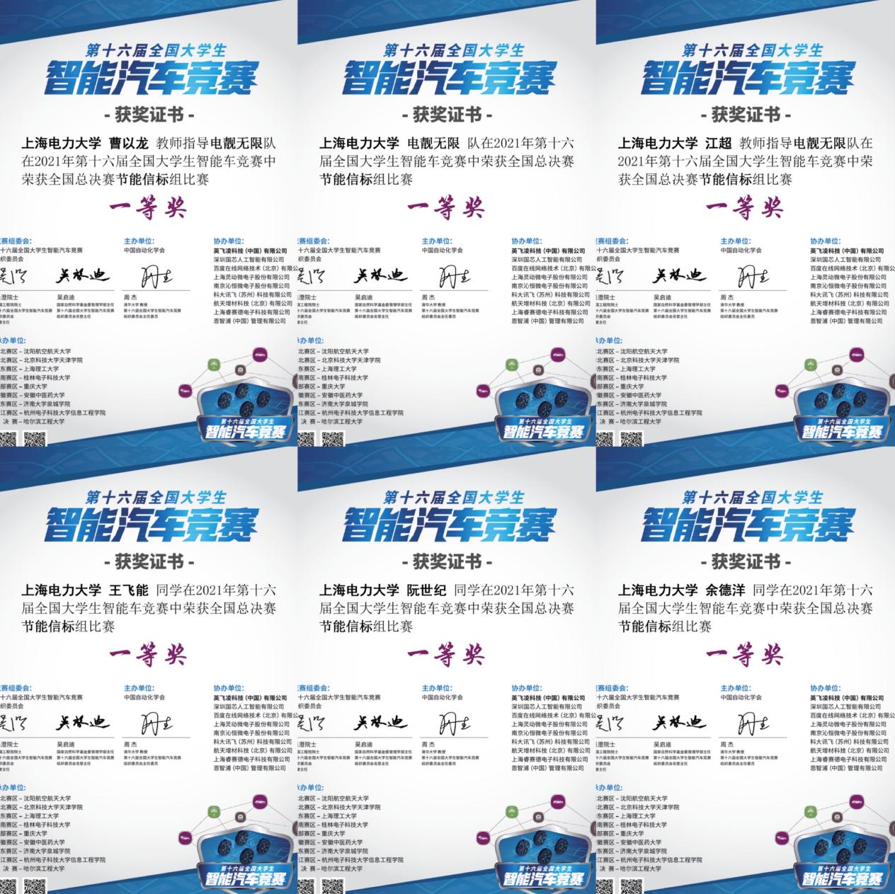 近日,来自电信学院的智能车车队“电靓无限”于2021年第十六届全国大学生智能汽车竞赛中获得节能信标组全国第五名(并列)的好成绩,成功摘得全国一等奖;于此同时,参加2021年全国大学生物联网设计竞赛(华为杯)的“空天地立体化智慧电网线路守卫者”小队也传来捷报,一举摘得全国一等奖。