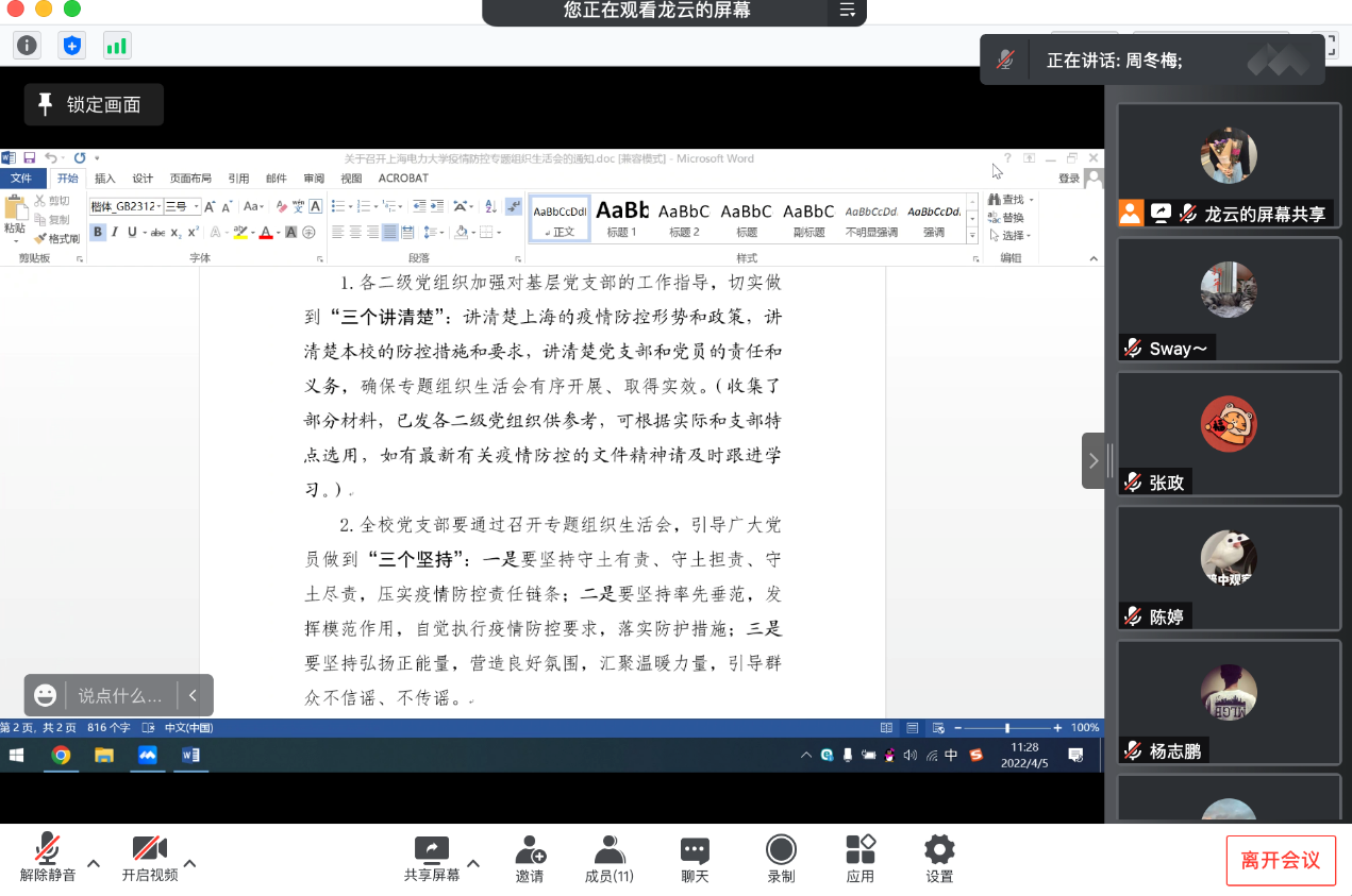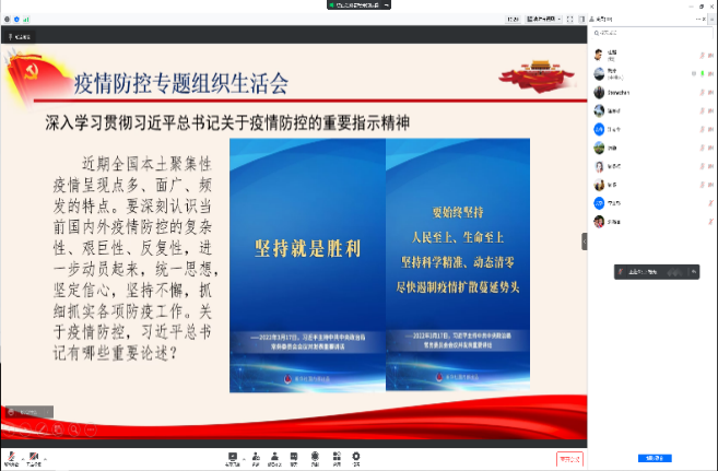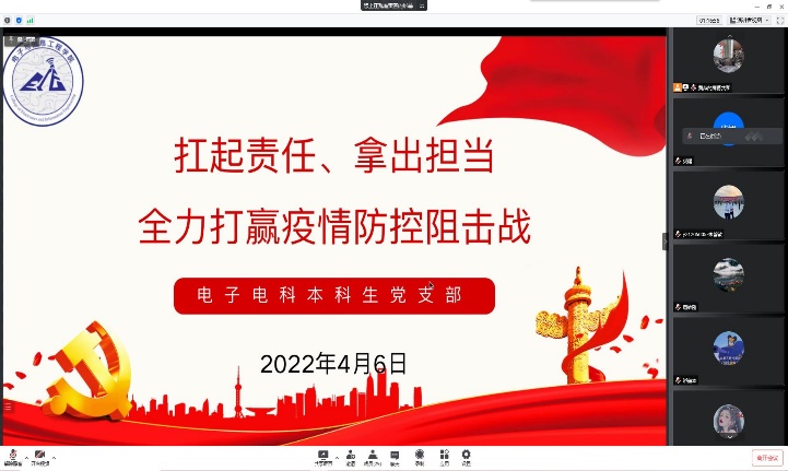为进一步传达党中央、教育部、上海市疫情防控有关精神和要求,明确上海高校疫情防控形势和学校疫情防控要求、明确党支部与党员的责任与义务,引领党员充分发挥党员在防疫工作中的先锋模范作用,电信学院各党支部在4月5-6日召开疫情防控专题组织生活会。