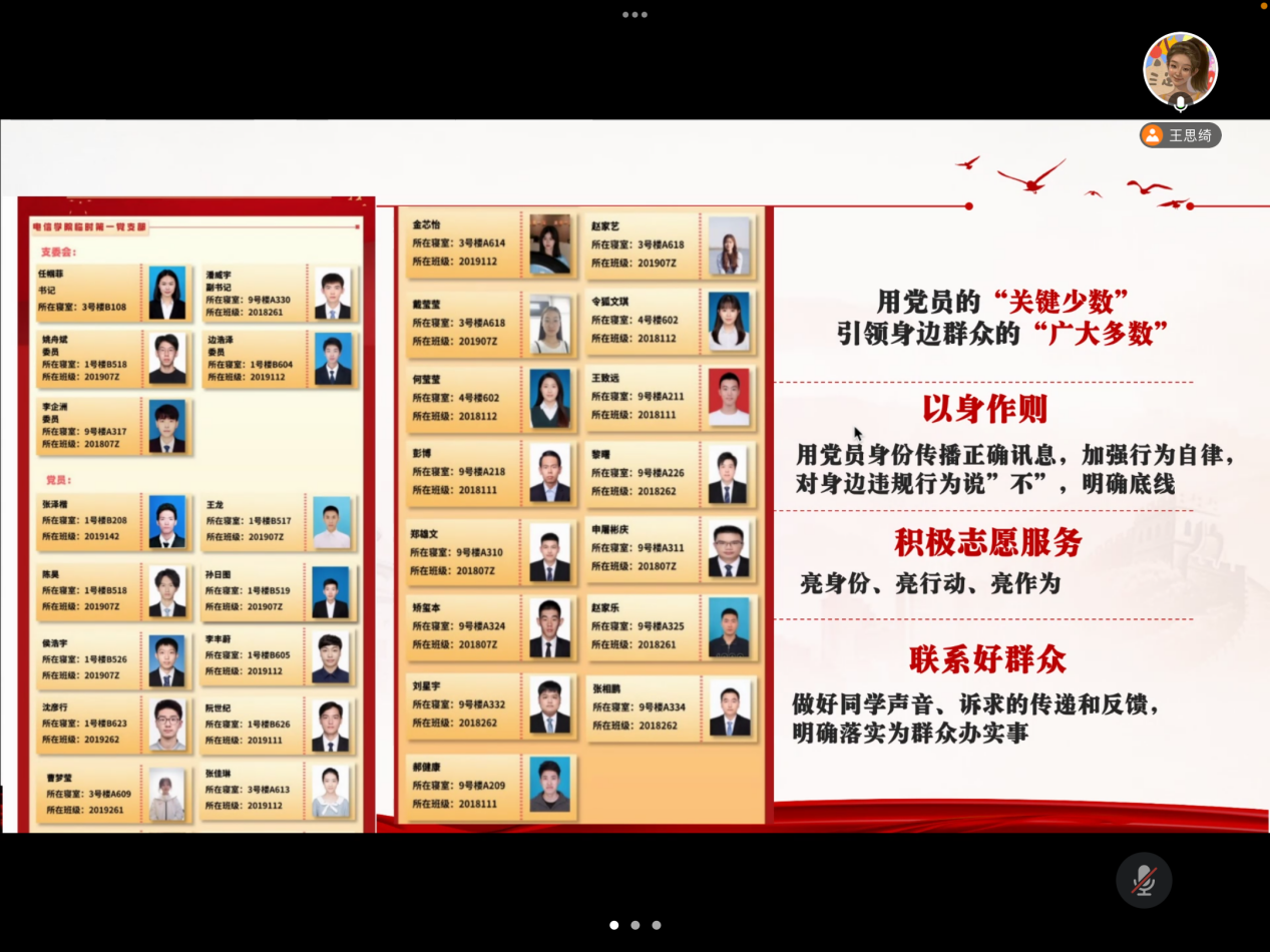目前电信学院全体党支部和党员时刻准备着,闻令而动,听令而行。继续保持清醒的头脑,传播正确信息,加强行为自律,明确落实“我为群众办实事”。运用临时党支部、运用党员的“关键少数”引领身边群众的“广大多数”。