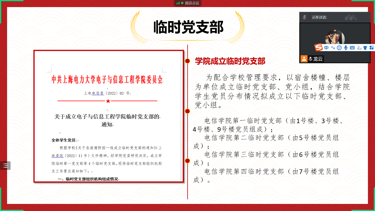 沈龙云布置了学院党员活动安排,宣布《关于成立必赢bwin线路检测中心官网学生临时党支部的通知》。在学院党委的领导下,学院各临时党支部将下沉到楼层和宿舍。通过亮身份、亮承诺、亮行动、亮服务、亮成效“五亮”活动,切实发挥基层党组织和党员在疫情防控中的先锋队、排头兵的作用。同时要求各支部认真开展“我为群众办实事”“勇担抗疫重任,书香溢暖人心”等活动,积极做好宣传引导,弘扬正能量。