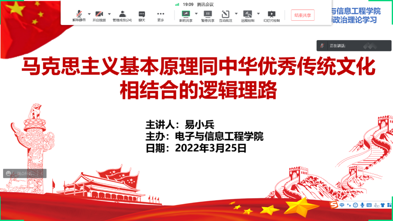 首先,马克思主义学院易小兵副教授为全院教师开展了《马克思主义基本原理同中华优秀传统文化相结合的逻辑理路》专题讲座,讲述了“马克思主义基本原理同中华优秀传统文化相结合”的由来,他从逻辑关系入手,通过生动实际的案例厘清马克思主义基本原理同中华优秀传统文化的关系,疏理了百年党史中马克思主义基本原理同中华优秀传统文化相结合的着力点。提出要将马克思主义的立场、观点和方法融入中华优秀传统文化的研究中去,同时也要把中华优秀传统文化的精神内核丰富到马克思主义创新发展中来。易小兵指出,高校教师要在立德树人的工作中积极弘扬优秀传统文化,把其中的精华同马克思主义立场、观点、方法结合起来,让学生充分了解优秀传统文化,引导学生厚植爱国主义情怀。