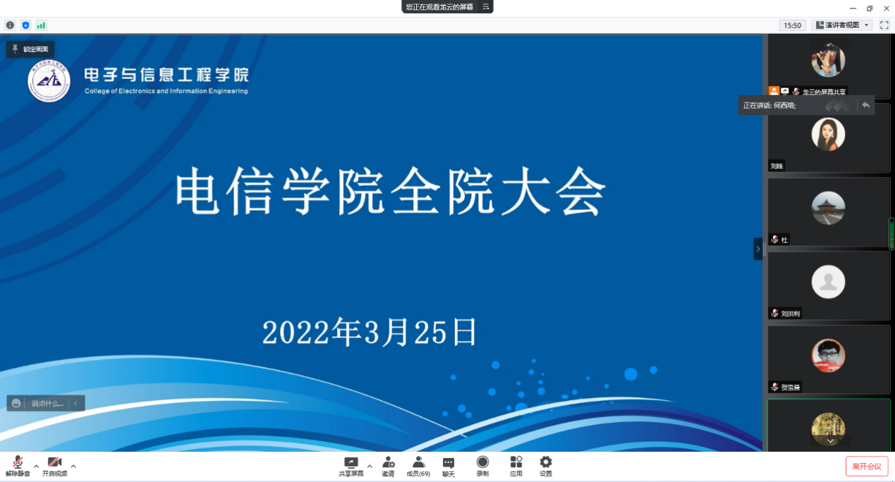 3月25日下午,电信学院全院教职工大会暨教师政治理论学习会通过腾讯会议召开,学院全体教职工参加了此次会议。会议由学院党委书记何西培主持。