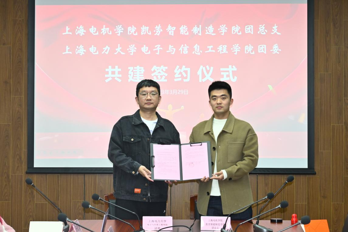 为充分发挥临港各高校的特色优势,为高校培养更多高素质、高能力的复合型学生骨干,在科创、志愿服务、实训等方面提供更大空间,促进临港高校之间友好交流,3月29日下午,上海电机学院凯撒斯劳滕智能制造学院团总支与我校必赢bwin线路检测中心官网团委在临港校区学术楼107会议室举行共建签约仪式。电信学院团委书记李天成、凯劳智能制造学院团总支书记滕宇及两院学生代表出席本次活动。