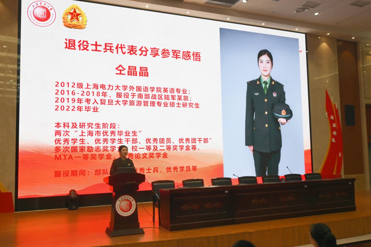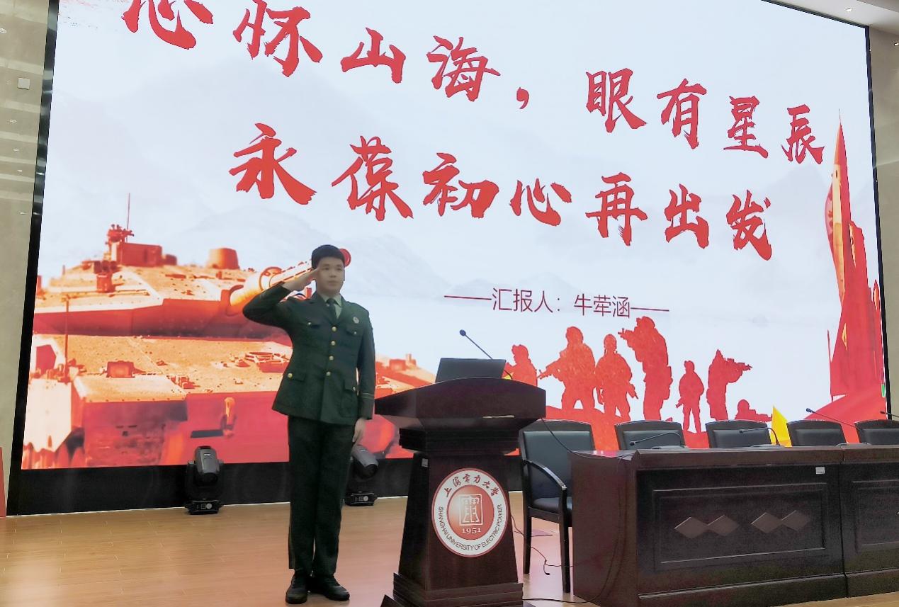 老兵讲故事”环节,退伍士兵代表曾文泓、牛荦涵、杨宇轩,分别以《无奋斗不青春》《心怀山海,眼有星辰,永葆初心再出发》《新征程,再出发》为题分享了他们的部队生活和成长经历。从一名通信兵的成长,到打破军体考核400分的记录,到助力中国“航天梦”的腾飞,退伍士兵突破自我、挑战青春、保家卫国的真实故事让在场同学热血沸腾、充满向往。