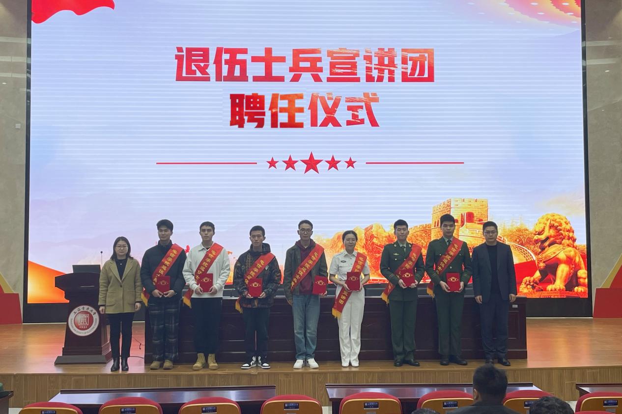 周冬梅和薛正豪为退伍士兵颁发了“电信学院退伍士兵宣讲团”聘书和绶带,鼓励他们继续展现军人风采,讲好军人故事,积极传播红色正能量,做好征兵宣传工作的“先锋号”。