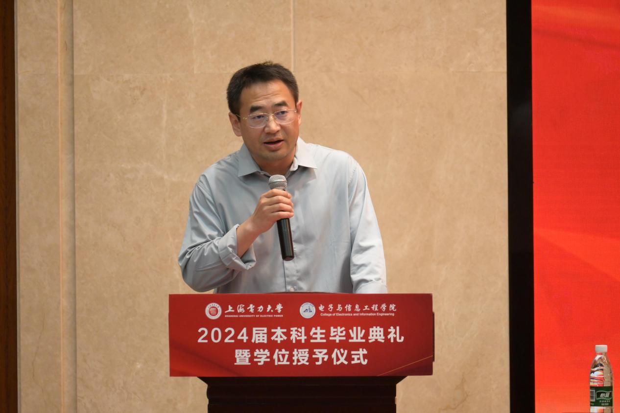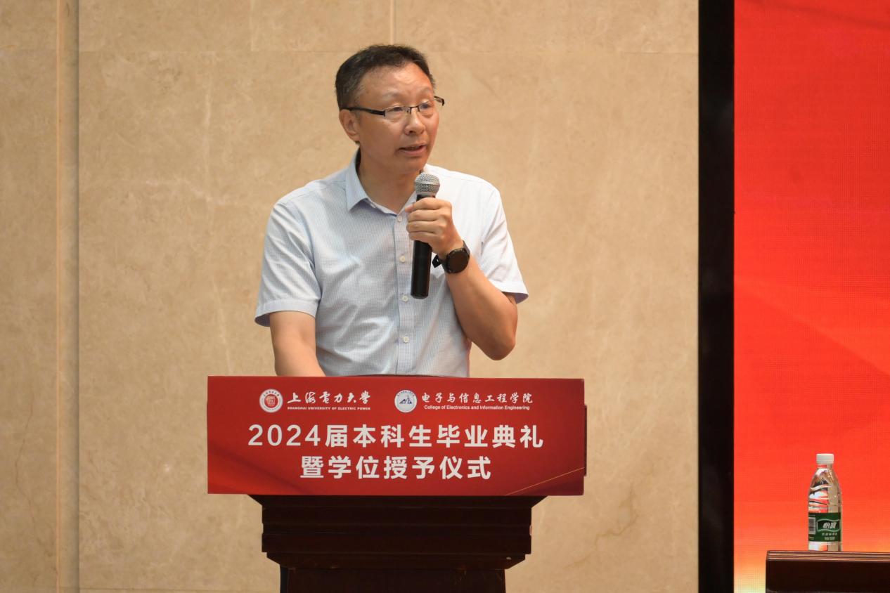 院长崔昊杨代表学院向全体毕业生表示祝贺,向关心学校发展、支持学校工作的家长们表示衷心感谢,向辛勤耕耘、默默奉献的老师们致以崇高敬意,他对毕业生过去四年的成长生涯进行了回顾与肯定,对同学们在学术、实践、创新等方面的卓越表现给予了高度评价,希望毕业生们在新的人生道路上眼中有光,厚植家国情怀;脚下有路,不畏艰难险阻;心中有爱,常怀敬畏之心,带着电信人的初心,驶向各自人生的理想国。