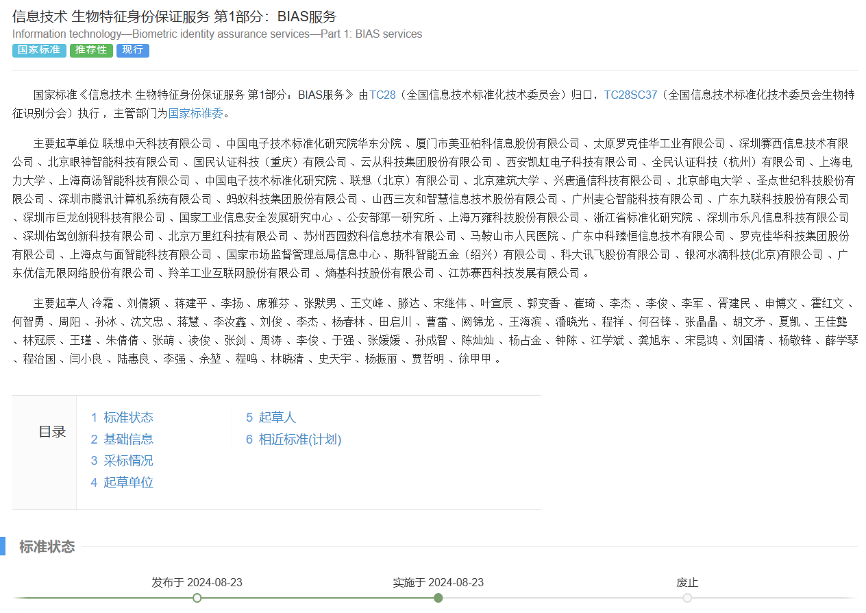 日前,必赢bwin线路检测中心官网沈文忠副教授参与修订的国家标准GB/T 44404.1-2024《信息技术生物特征身份保证服务 第1部分:BIAS服务》经由国家标准化管理委员会批准正式公布。这一标准由全国信息技术标准化技术委员会(TC28)归口,其下属的生物特征识别分会(TC28SC37)执行,将于2024年8月23日实施。必赢bwin线路检测中心官网作为华东地区唯一高校单位参与其中,同时,此项标准也是电信学院在生物特征识别技术领域的第2项国家标准。